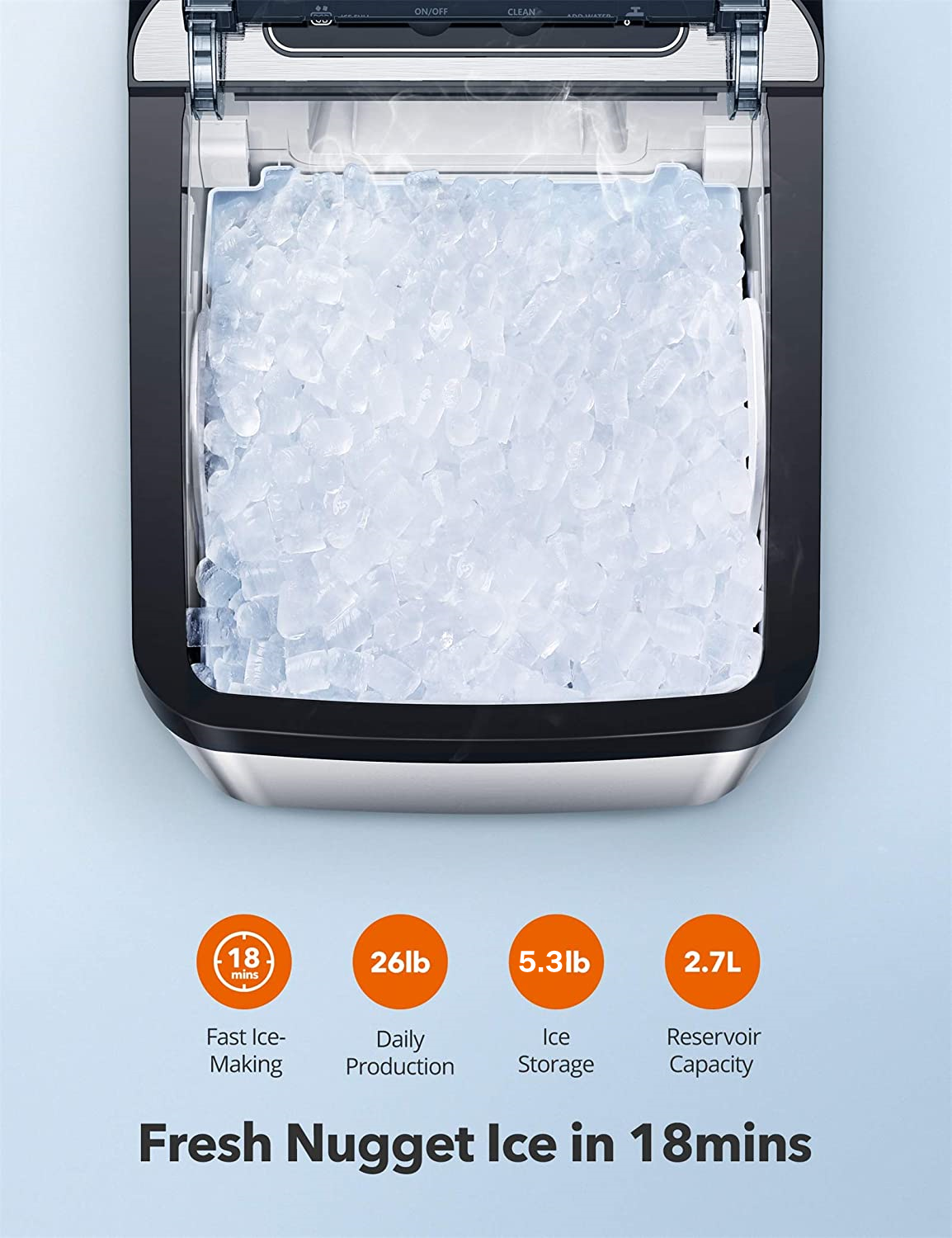 Storage & Water Tank: Holds up to 5.3 lbs of nugget ice in the storage bin and features a 2.7L water tank for efficient ice-making.