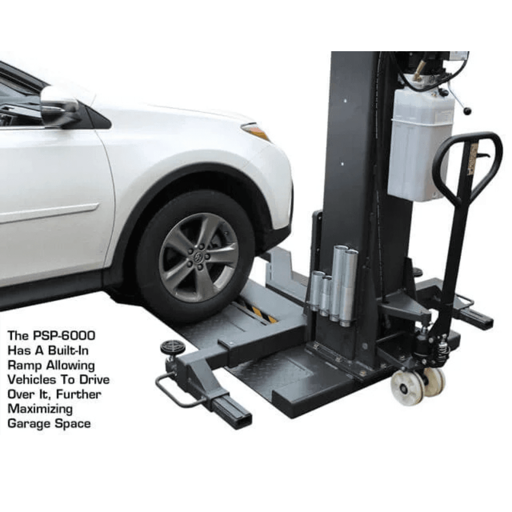 Its low-profile design, built-in drive-over ramps, and single-point lock release make it a practical and space-saving alternative to permanently mounted lifts. When not in use, the PSP-6000 can be easily rolled out of the way, maximizing garage space.