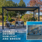 The Sarasota Louvered Pergola elevates your outdoor living space with beautiful modern style. Built with heavy-duty, galvanized steel, its adjustable louvers can be easily opened to allow filtered sunlight through or closed completely to enjoy shade and weather protection. Complete with powder-coated steel posts and anchoring plates, the Sarasota is Pro-Tect™ tested and proven to withstand up to 3,100 pounds of roof weight and 100 mph wind speeds*, ensuring a lasting upgrade to your backyard. The integrated drainage system directs rainwater to downspouts in the steel posts and is equipped with gutter guards to prevent debris blockages. The 100% galvanized powder-coated steel is not only completely maintenance free but is also rust and corrosion-resistant for contemporary charm that’s built to last. Boasting sleek lines and an elegant black finish, this contemporary patio pergola accommodates seating, tables, and decor for a stylish, comfortable outdoor living space. With our patented PowerPort™, featuring three electrical outlets and USB ports, it’s easy to connect lighting, music, devices, and more. This outdoor pergola kit is ready to assemble and offers guided instructions through the BILT® app for easier installation
