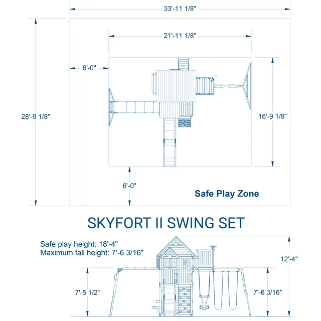 The Skyfort II Swing Set will elevate your children’s playtime and add charm to your landscape. Featuring a raised clubhouse with a wood roof, windows, covered entryway, and bay windows, this set feels like a majestic wooden castle designed for endless adventures.