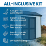 Comes with a pre-cut DIY kit for easy and efficient assembly. The kit includes pre-cut wood materials, a complete floor system, roof system, fasteners, and a handle. Step-by-step instructions make installation possible in 6-8 hours with the 2×4 EZ frame construction and polycarbonate roof. The pre-primed siding allows for easy painting and caulking after assembly to waterproof the shed.