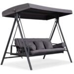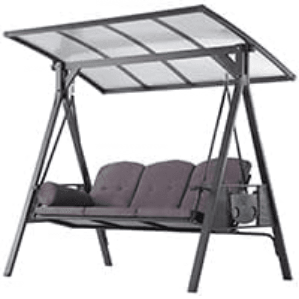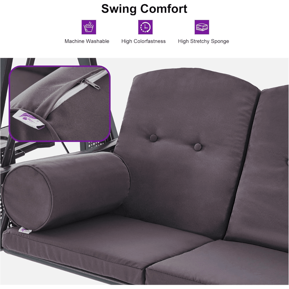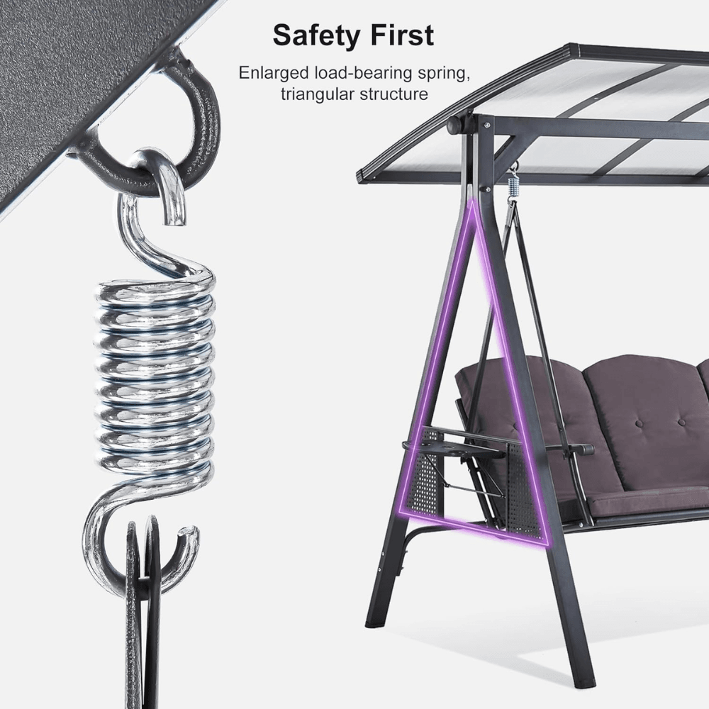 Upgrade your outdoor relaxation experience with the PURPLE LEAF Outdoor Swing, designed for ultimate comfort, durability, and convenience. Featuring a sturdy powder-coated steel frame, a UV-resistant adjustable hardtop canopy, and built-in side tables, this three-seat swing is perfect for porches, patios, gardens, and backyards.