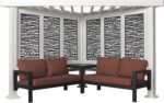 What do you get when maintenance free design and shade meet privacy and flexibility. Cue the Ridgedale Cabana Pergola with patio seating by Backyard Discovery. Constructed from 100% galvanized steel, the Ridgedale cabana pergola includes built-in steel seating with 4 color options of market leading Sunbrella cushions, as well as an integrated side table, durable composite panels and soft canopy for privacy and shade. Intended to wow, the unique architecture of the Ridgedale will beautify any location with its functionality. Whether it be pool or lakeside, fire pit or garden or even your main patio sectional. the possibilities are endless with the high-performance Ridgedale Steel Cabana Pergola. Backyard Discovery’s steel product line uses 100% galvanized steel and stainless-steel hardware both powder-coated to fully protect against rust, corrosion and UV harm. Regardless if it’s worry-free comfort, relaxation or entertaining that you’re after, the Ridgedale Steel Cabana Pergola by Backyard Discovery has you covered.