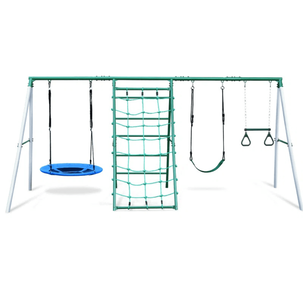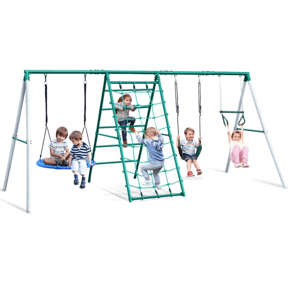Bring the ultimate adventure to your backyard with this multi-activity swing set, designed to keep kids active and entertained for hours. Featuring a belt swing, a spacious saucer swing, a climbing ladder, a climbing net, and a trapeze bar, this playset offers endless fun and physical challenges that promote balance, coordination, and strength.